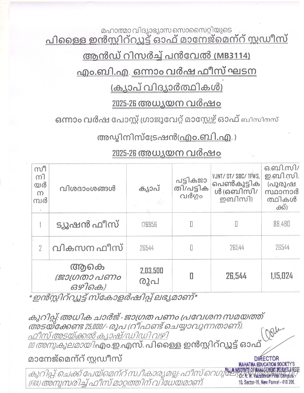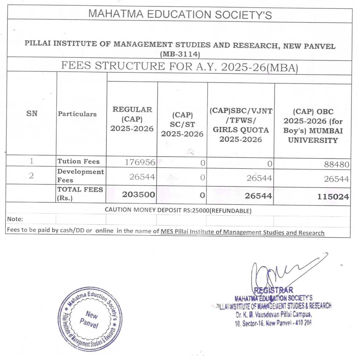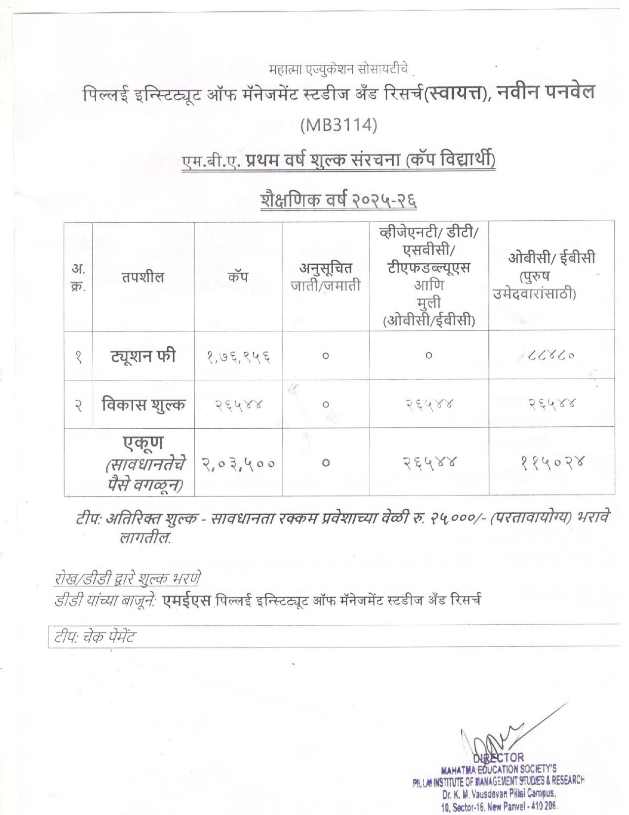 M.B.A. Fees Structure 2025-26