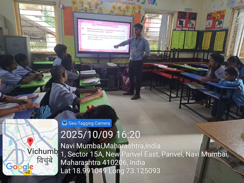 The session was designed for students of the 7th and 8th standards, focusing on improving their grammar, vocabulary, and reading abilities. The 8th standard students began with an English grammar quiz on tenses — past, present, and past participle — which helped them recall and apply concepts from their syllabus. This was followed by a vocabulary-building game involving identifying names of animals and colours, and a simple math-based activity that integrated addition and multiplication in an enjoyable format. For the 7th standard students, the focus was on reading comprehension and vocabulary development. They enthusiastically participated in reading the story “Tiny Tinny Pots”, followed by exercises on synonyms and antonyms, and engaging word games that reinforced new vocabulary and improved recall.