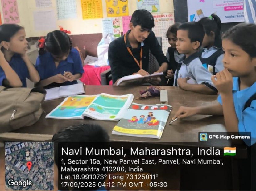 The learning outcomes of the session included improved recognition and spelling of both simple and complex words, enhanced vocabulary using real-life examples, better pronunciation and reading fluency, increased classroom participation, and a positive learning experience in a supportive environment. The session was conducted by MMS students Akshada Rajkar, Sarvesh Deo, and Lipakshi Gawale, who demonstrated enthusiasm and creativity in their teaching approach.